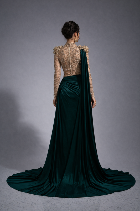 Pearl Embellished Velvet Mermaid Evening Dress | Full Sleeve