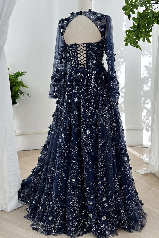 3D Floral Lace A-Line Evening Dress | O-Neck Full Sleeve Formal