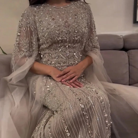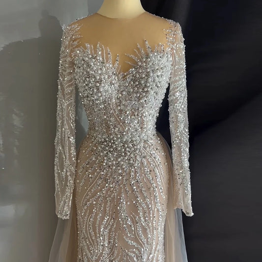 Pearl Beaded Tulle Mermaid Evening Dress | O-Neck Detachable Train