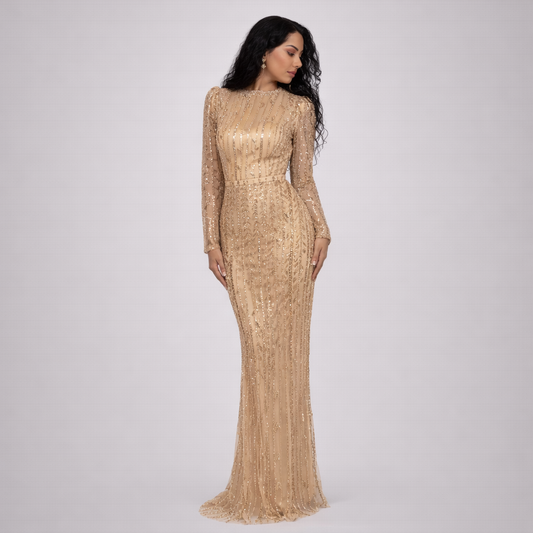 Pearl Embellished Mermaid Evening Dress | Scoop Neck Full Sleeve