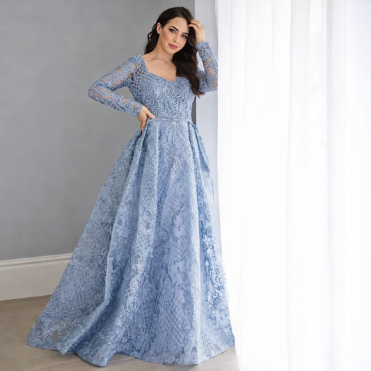 3D Floral Lace A-Line Evening Dress | O-Neck Full Sleeve Formal