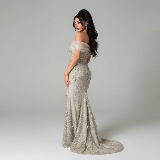 Crystal Beaded Mermaid Evening Dress | Off Shoulder Lace Court Train