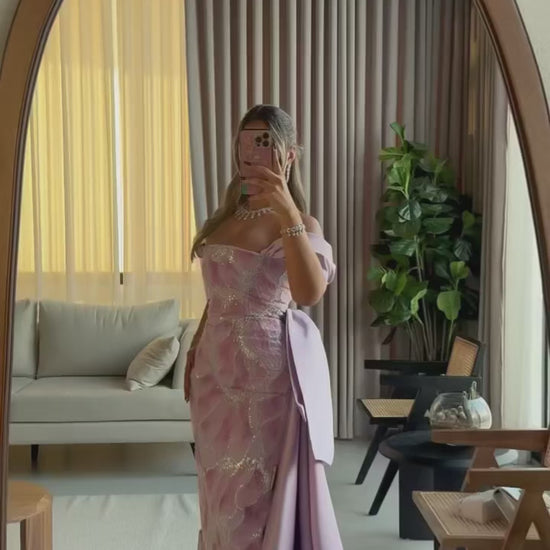 Introducing Lavanda Reale (Royal Lavender) from our exclusive Rose Reverie collection. This luxurious beaded mermaid evening dress features exquisite lace fabric in stunning lavender with breathtaking beaded embroidery, elegant off-shoulder bow details, and a dramatic overskirt train. The sophisticated design creates a regal, glamorous look perfect for formal occasions, weddings, and prom events. This dress is fully lined and not see-through, ensuring complete coverage and confidence.