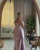 Lavanda Reale showcases premium lace and polyester fabric in a rich lavender hue with eye-catching beaded embroidery and sequin embellishments. The off-shoulder neckline with elegant bow details creates a romantic, regal aesthetic. The dramatic overskirt train provides a feminine, sophisticated silhouette. The dress features a full lining for modesty and comfort.